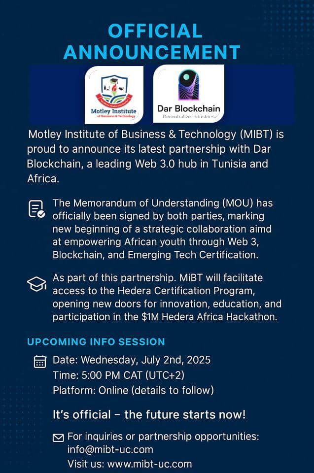 Kitwe, Zambia – The Motley Institute of Business & Technology (MIBT), in partnership with Dar Blockchain (Tunisia), has officially launched the continent’s most ambitious Web3 initiative to date — the $2 Million Africa Web3 Hackathon, powered by Hedera Hashgraph.